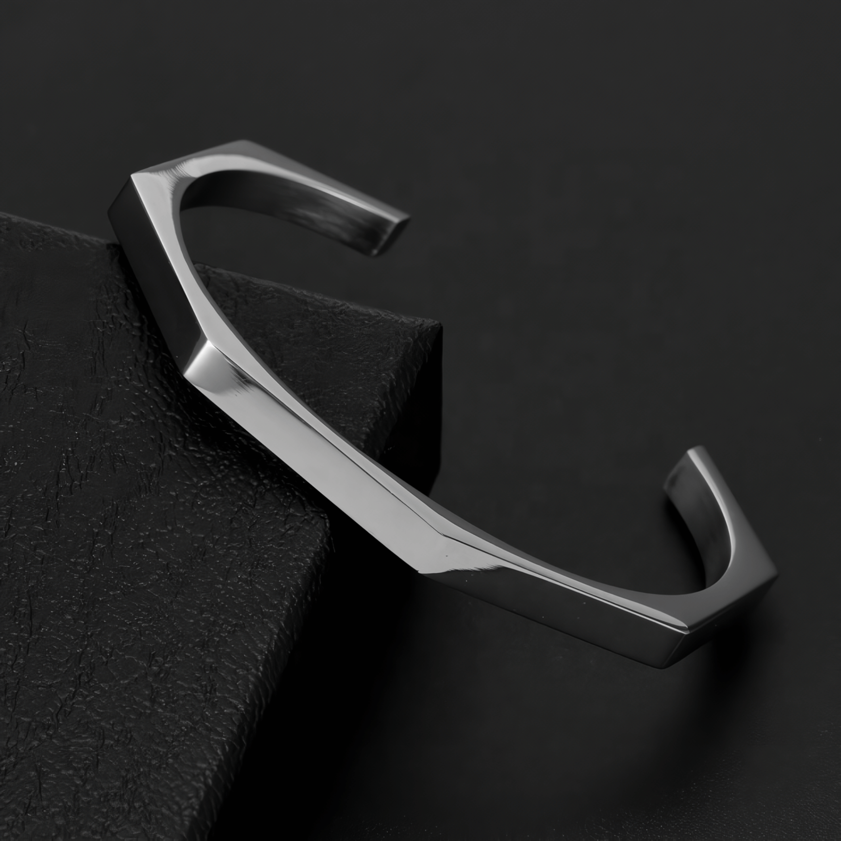 Sculpted for bold minimalists, the Hexagon Bangle combines sharp angles with a polished stainless steel finish. Its geometric form delivers modern edge and timeless sophistication — perfect solo or stacked for a statement of strength and style.Designed with a 60mm inner diameter, it offers a comfortable fit while maintaining its structured silhouette. The Hexagon Bangle is more than just an accessory — it’s a statement of precision and individuality.